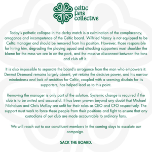 Following what many supporters described as a humiliating derby collapse, anger has moved beyond frustration on the pitch and shifted toward deeper, structural issues within the club. The statement pulls no punches, accusing the Celtic board of complacency, arrogance, and a sustained failure to act in the best interests of the club and its supporters.